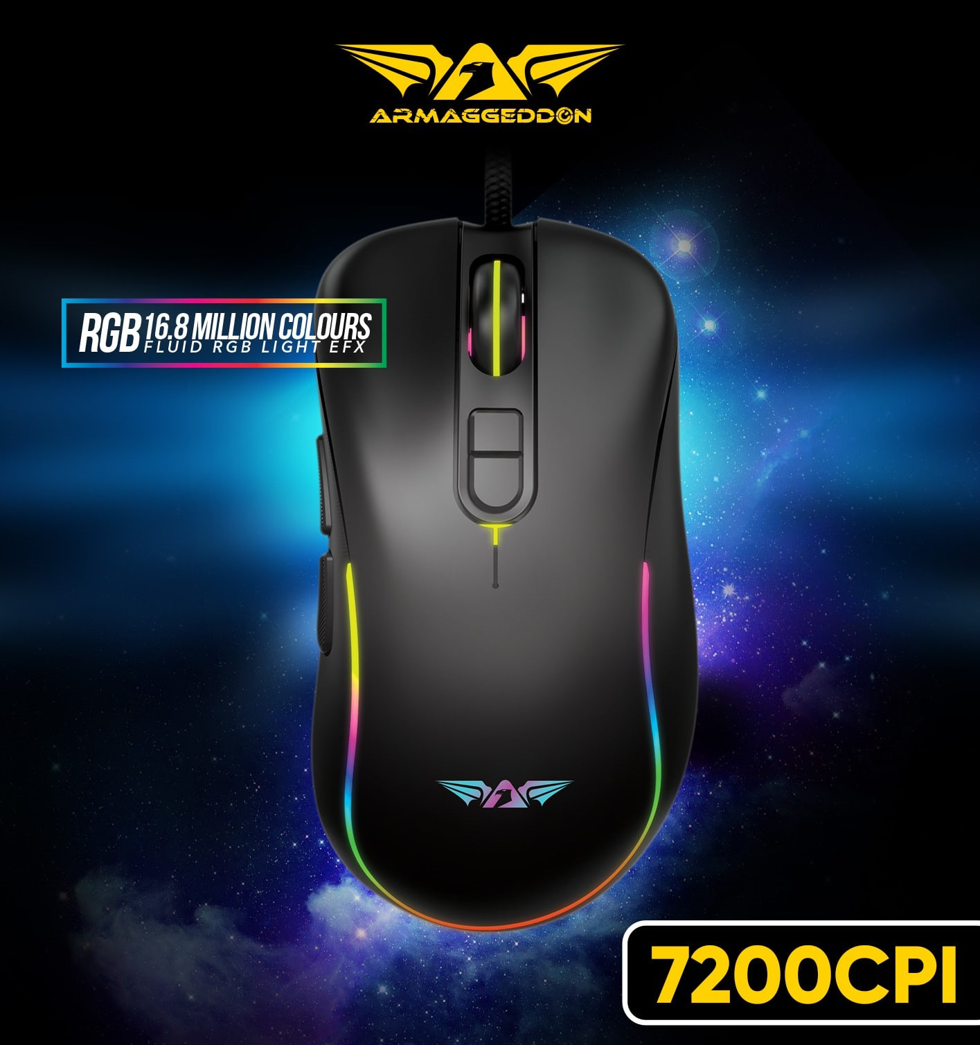- Gaming miš srednje veličine sa gaming podlogom u pakovanju- Podesivo RGB osvetljenje 16.8 miliona boja- Huano Switchevi- Armaggeddon Custom 814 Optical software optimized gaming sensor- Resolution: 200 - 12800CPI- Frame rate: 6000fps- Acceleration: 15G- Polling rate: 500Hz- Tracking speed: 60ips- Dužina kabla: 1.8m Ultra Durable Rubberized Cable- Dimenzije: 64 x 41 x 124mm- Macroi: 5 tastera i 2-Way click scroll- Matt UV Surface Finish- Dodatne teflonske podloške u pakovanju