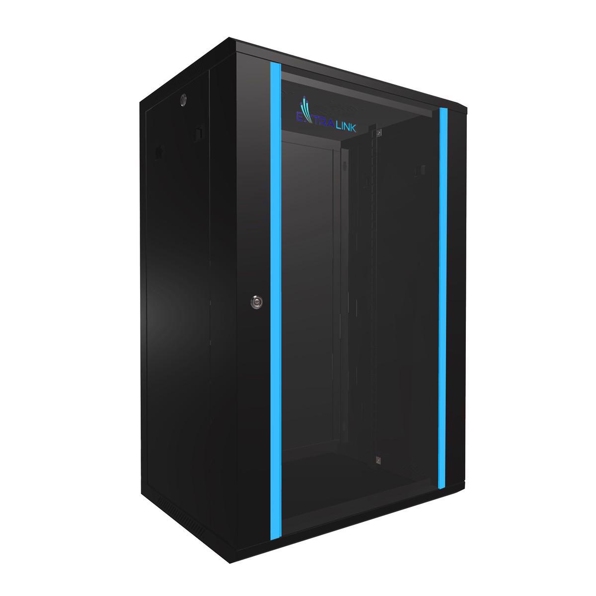 Extralink rek ormar je dizajniran za montažu na zid u kancelarijama, sobama sa mrežnim serverima i kontrolnim sobama za video nadzor.Spoljni zidovi su napravljeni od hladno valjanog čeličnog lima. Opremljen je kaljenim staklom, prednja vrata se mogu otvarati na levu ili desnu stranu.Vertikalne šine su označene odgovarajućom visinom, koja je 18U (od jedinice), dok je ukupna visina reka 91 cm.Reze na bočnim zidovima omogućavaju uklanjanje. Brave i ključevi su uključeni.Na vrhu reka postoje 2 mesta za postavljanje ventilatora radi boljeg hlađenja uređaja, a postoji i dodatni prolaz za kablove.