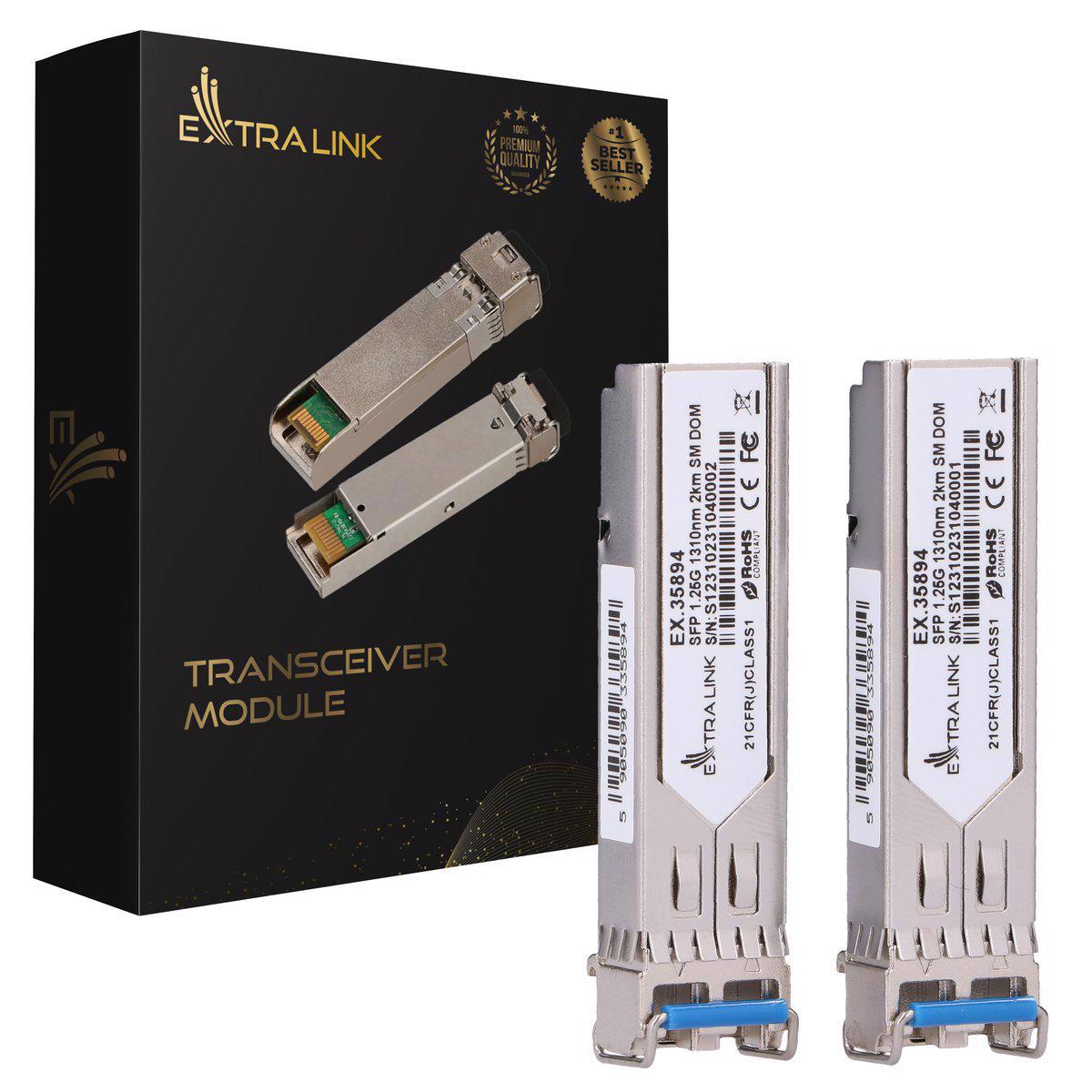 Extralinkov 1.25G SFP modul sa specifikacijom podataka do 1.25 Gbps ima LC/UPC konektor i talasnu dužinu od 1310 nm koja omogućava domet prenosa do 2 km u jednom modu sa DOM funkcijom koja omogućava praćenje u realnom vremenu. Radni parametri kao što su temperaturni napon, napajanja, laserska polarizaciona, struja i preneta i primljena optička snaga.